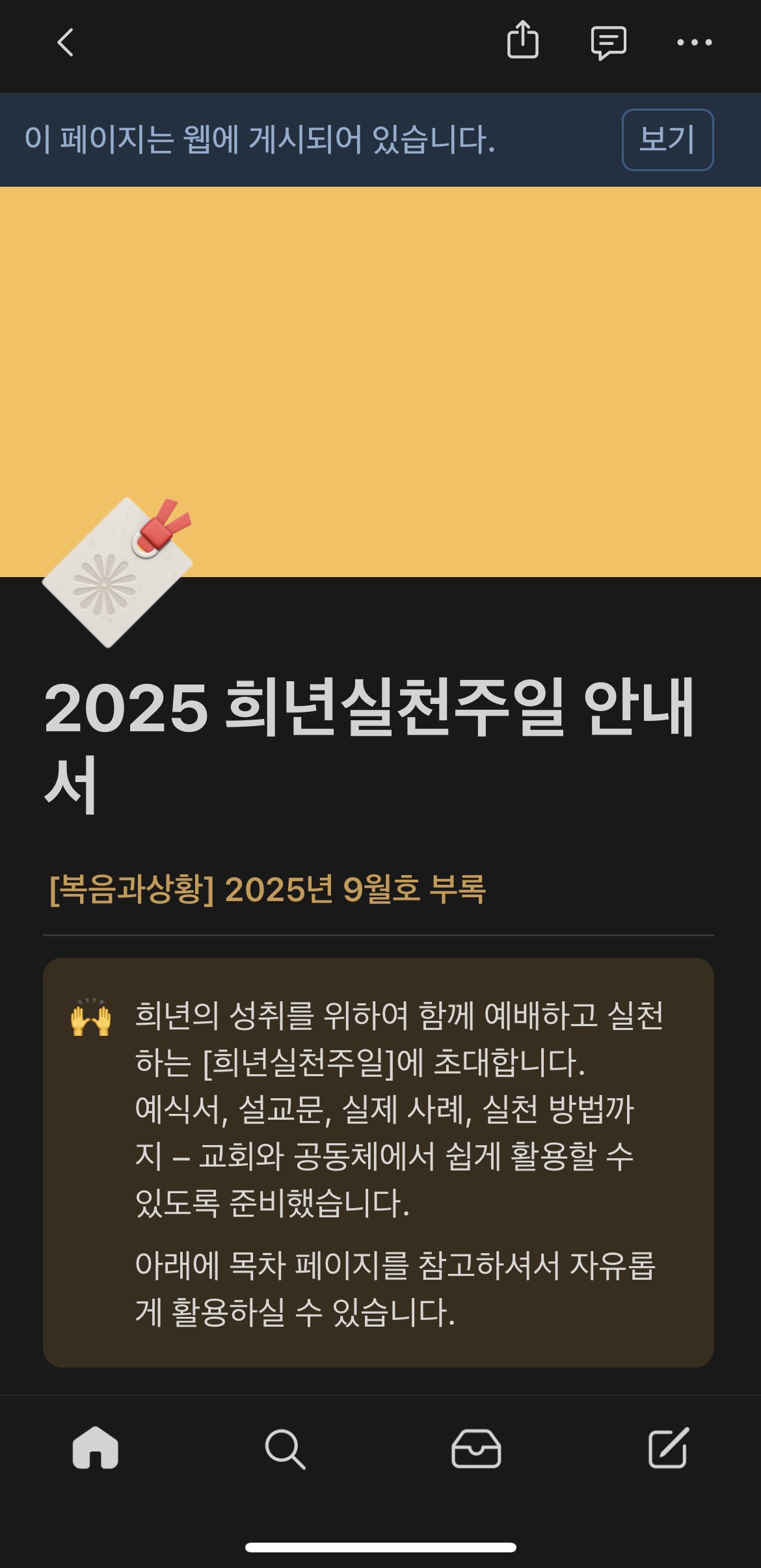 2025 희년실천주일 안내서조합원 함께 공간/상담·대출·사역 and 오늘 2025. 9. 8. 15:39희년실천주일 안내서 온라인 공개![복음과상황] 9월호 책갈피 부록으로만 공개한 희년실천주일 안내서의 링크를 온라인에서도 공개합니다!희년실천주일을 지키는 아주 간단한 방법!신앙고백문, 예식서, 예시설교, 희년실천이슈까지!희년실천주일의 다양한 컨텐츠들을 만나보실 수 있습니다.희년실천주일 안내서 링크: bit.ly/2025희년실천주일(이미지의 큐알코드를 통해서도 들어가실 수 있습니다.)9월 28일은 희년실천주일입니다!많은 교회와 공동체가 함께 희년실천주일을 지켜주세요.+전세사기 피해자들과 함께 드리는 희년실천주일 연합예배도 많은 관심 부탁드립니다.일시: 2025년 9월 23일(화) 오후 7시 30분장소: 서울시의회 본관 세월호 기억공간 앞 (시청역 3번 출구)후원: 우체국 013920-02-202377 희년함께